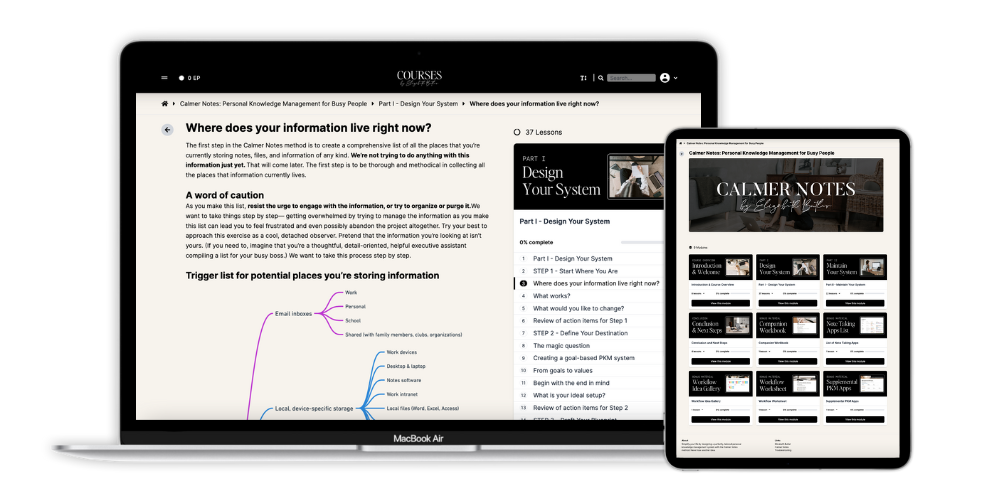 The Calmer Notes course shows you how to reate a streamlined, perfectly-tailored personal knowledge management system. Never lose another idea.